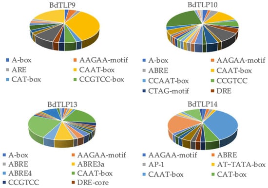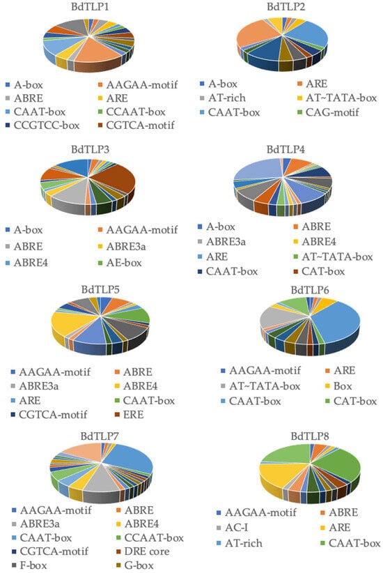 3.3. Cis Elements in BdTLP Promoters and Gene Expression during Developmental Stages