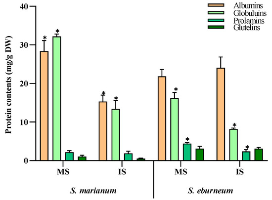 In both S. marianum and S. eburneum seeds, albumins and globulins were the predominant protein fractions in both mature and immature seeds (Figure 1). In mature S. marianum seeds, albumins accounted for 28.4 mg/g DW and globulins for about 32.2 mg/g DW. However, in mature S. eburneum seeds, albumins comprised about 21.9 mg/g DW and globulins about 16.2 mg/g DW. Additionally, there was significant variation in the levels of prolamins and glutelins between the two plants, especially in mature seeds. Mature S. eburneum seeds exhibited the highest levels of prolamins and glutelin, measuring 4.4 and 3.1 mg/g DW, respectively.
