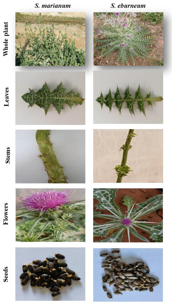 The Silybum genus is classified within the tribe Asterales of the Asteraceae family and is native to the Middle East, the Arabian Peninsula, the Indian subcontinent, North Africa, and certain regions of Europe. It has been introduced to various regions, including Japan, sub-Saharan Africa, North and South America, parts of Europe, Australia, and New Zealand [6]. The genus Silybum comprises two closely related species: S. marianum (SM) is characterized by its variegated foliar morphology and S. eburneum (SE) exhibits a uniform green leaf [7]. Initially considered distinct species, genetic studies have since revealed that these two variants are closely related and likely represent different forms or varieties within the same species [8,9]. S. eburneum is a non-grass herb, a wild plant characterized by its glabrous, spine-scented nature. It typically thrives as an annual or biennial species, predominantly found in marginal land, grassy banks, and river flats. This erect plant can reach heights ranging from 15 to 300 cm. It produces solitary, light purple (occasionally white) flowers, often in profusion, from the months of June through September. The leaves are uniformly green, simple, and arranged alternately along the stem. They are lanceolate in shape, featuring denticulate margins and petiolate attachments. The seeds are notably hard and come equipped with a white, silky pappus for dispersal [9]. For S. marianum, leaves are arranged alternately and are notable for their significant size and glabrous texture, featuring spiny margins. These leaves typically measure between 50 and 60 cm in length and from 20 to 30 cm in width [10]. The plant’s stem exhibits a height range of 40 to 200 cm, displaying a smooth or slightly downy texture. It maintains an erect posture and undergoes branching primarily in the upper section of the plant [11]. Each stem culminates in a flower head, approximately 5 cm in diameter, displaying a distinctive red-purple hue. The inflorescences are encircled by protective spiny bracts [12]. The seeds are achenes measuring 5–8 mm in length, featuring an elongated white pappus and exhibiting a color spectrum spanning from black to brown [13]. The weight of 1000 seeds ranges from 28 to 30 g. Each flower head yields approximately 190 seeds, resulting in an average seed production of 6350 seeds per individual plant [14]. Furthermore, it is noteworthy that seeds can maintain viability in the soil for as long as nine years [15].