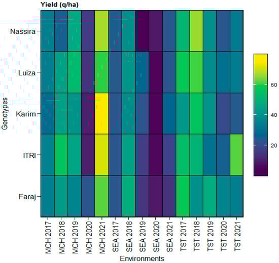 Heatmap illustrating yield variations across genotypes (Faraj, Itri, Karim, Luiza, and Nassira) and environments (SEA 2017–2021, MCH 2017–2021, and TST 2017–2021).