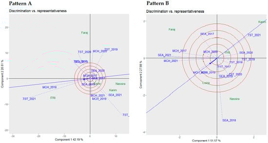 Comparative biplot analysis of environmental discrimination and representativeness: yield (Pattern A) and protein (Pattern B).