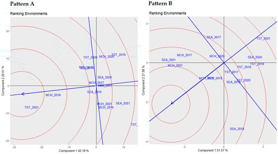 Pattern A of Figure 3 details the analysis based on yield data. The biplot indicates that the first component accounts for 42.19% of the variability, while the second component explains 26.61%, representing a significant proportion of the total variability. TST 2021 stood out as the most discriminating environment, in contrast to SEA 2017, which was marked as the least discriminating. On the other hand, MCH 2018 was identified as the most representative environment, capturing a broad spectrum of environmental variables. Notably, the variety of Luiza stood out, highlighting its adaptability across varied environmental conditions. Such nuanced observations are crucial for advancing understanding in environmental studies, mainly when focusing on yield variability across diverse environments.