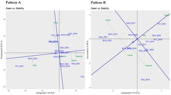 Comparative biplot analysis of genotypic mean performance and stability: yield (Pattern A) and protein content (Pattern B).