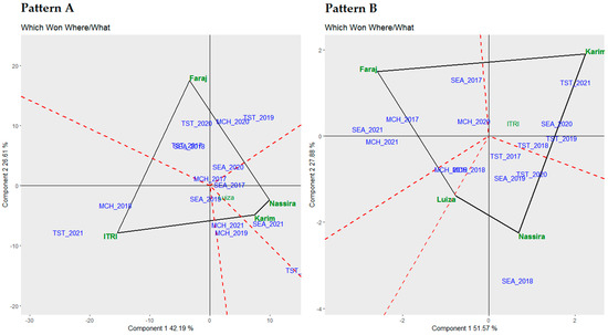 Pattern A of Figure 6 depicts the analysis for yield. This polygon pattern identified the leading genotypes of each environment, shedding light on their adaptability and performance under certain conditions. Itri was the top-performing genotype under environments MCH 2018 and TST 2021, emphasizing its adaptability and high yield under these settings. On the other hand, Faraj emerged as the best-performing genotype in TST 2020, MCH 2020, TST 2019, TST 2017, and SEA 2018, signifying its strong performance and versatility across a diverse set of environments. Furthermore, Nassira and Karim were highlighted as the leading performers in SEA 2021, demonstrating their exceptional yields under this setting.