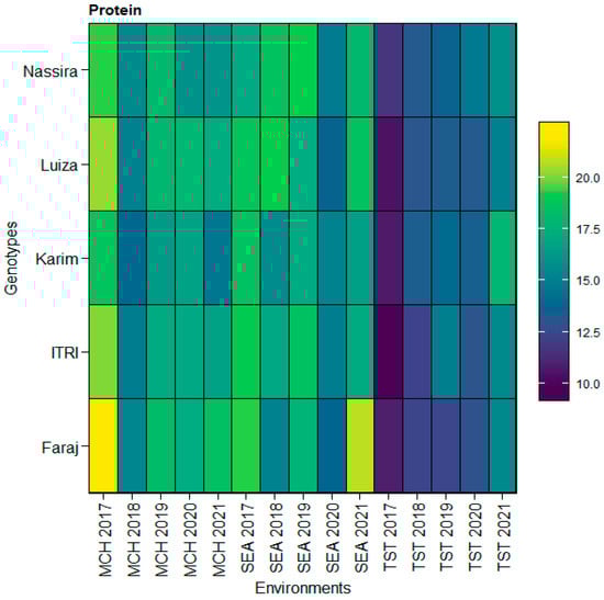 Delving deeper, the consistency of the Faraj genotype in maintaining a relatively high protein content across different environments, depicted in the heatmap, echoes the potential genetic resilience some genotypes exhibit towards environmental perturbations. While this is consistent with the theme that environmental factors and their interactions with genotypes play a significant role in the expression of quality traits in wheat, there is also evidence highlighted by studies conducted by Kyratzis et al. [55] and Bnejdi [56]. The significant decline in protein content over specific years reflects the environmental influence on this crucial quality trait. This observation resonates with previous findings highlighted by studies conducted by Zhang et al. [57], Nigro et al. [58], and Muqaddasi et al. [59].