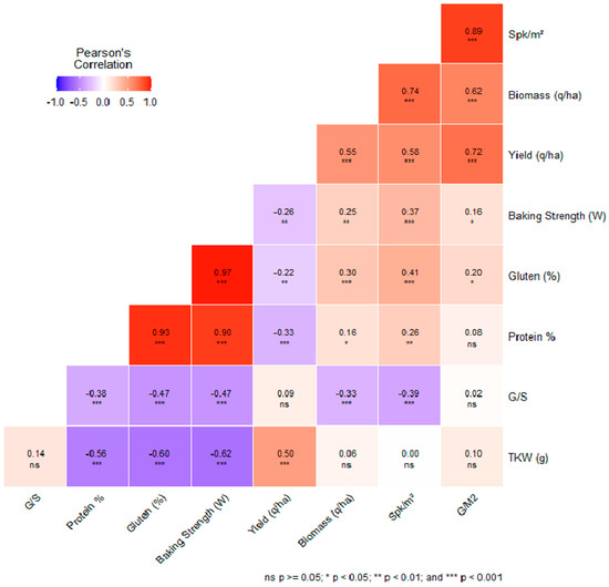 In the context of genotype–environment interactions, agronomic traits, such as yield, biomass, thousand kernel weight (TKW), spikes per square meter (Spk/m2), grain-to-straw ratio (G/S), and grain yield per square meter (G/m2), were evaluated alongside quality traits, such as protein percentage, gluten percentage, and baking strength. Pearson correlation coefficients and their respective p-values were calculated to gauge the relationships between these agronomic and quality traits (Figure 8).