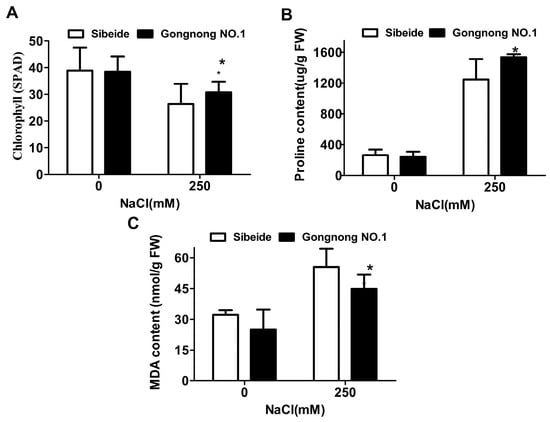 Under NaCl stress, the chlorophyll and proline content were slightly higher in ‘Gongnong NO.1’ than in ‘Sibeide’ under NaCl stress, while Malondialdehyde (MDA) content was lower in ‘Gongnong NO.1’ than in ‘Sibeide’ under salt stress (Figure 2). Taken together, the above results indicate that ‘Sibeide’ is more sensitive to salt treatment compared with ‘Gongnong NO.1’.