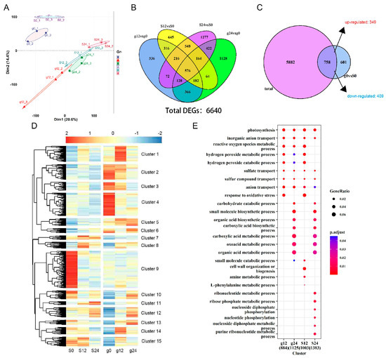 To gain a comprehensive understanding of the transcriptome of the salt-tolerant variety ‘Gongnong NO.1’ and the salt-sensitive variety ‘Sibeide’ alfalfa seedlings, we conducted high-throughput RNA-Seq analysis after treating 7-day-old seedlings with 250 NaCl for 0 h, 12 h, and 24 h. The RNA-Seq analysis yielded between 21.85 and 23.36 million reads. The sequencing quality of the RNA-Seq tags, as assessed by saturation analysis, met the requirements for differential gene expression analyses. Approximately 80.41% of the reads were successfully mapped to either multiple (5.50%) or unique (74.91%) genomic locations, while 19.59% remained unmatched (Supplementary Table S1). Principal Component Analysis (PCA) indicated that the DEGs were expressed at background levels 12 h after salt stress in both alfalfa varieties (Figure 3A). The Venn diagram illustrated the distribution of DEGs from ‘Gongnong NO.1’ (0 h, 12 h, and 24 h) and ‘Sibeide’ (0 h, 12 h, and 24 h). A total of 6640 DEGs were expressed at 12 h and 24 h treatment stages in both alfalfa varieties; 2392 and 3030 are expressed in g12 and g24 compared with g0; while 2711 and 3403 DEGs were expressed in S12 and S24 compared with S0, respectively (Figure 3B). Furthermore, 758 DEGs were identified in ‘Sibeide’ and ‘Gongnong NO.1’ alfalfa seed-lings under normal conditions (g0 vs. S0) compared to stress conditions (g12 vs. g0, g24 vs. S0, S12 vs. S0, and S24 vs. S0,), which exhibited co-expressed DEGs between the two varieties, among them, 349 genes were up-regulated and 409 genes were down-regulated (Figure 3C). Cluster and Kyoto Encyclopedia of Genes and Genomes (KEGG) analysis revealed that the DEGs were categorized into twelve groups based on their expression patterns (Figure 3D), and associated with photosynthesis, inorganic anion transport, reactive oxygen metabolic and response to oxidative stress in g0, g12, g24, S0, S12, and S24 (Figure 3E).