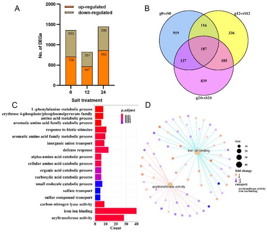 Comparison of differentially expressed genes in g0 vs. S0, g12 vs. S12, and g24 vs. S24. (A) Distribution of the sets of up- and down-regulated genes in ‘Gongnong NO.1’ and ‘Sibeide’ under salt treatment for 0 h, 12 h, and 24 h. The brown box above represents the down-regulated DEGs, and orange represents the up-regulated. (B) Venn diagram presenting g0 vs. S0, g12 vs. S12, and g24 vs. S24 co-expressed DEGs genes when exposed to NaCl stress conditions. (C) KEGG pathway enrichment analysis of co-expressed DEGs. (D) Co-expressed DEG mainly enriched in iron ion binding and acyltransferase activity.