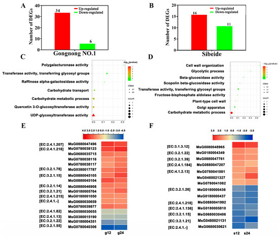 Expression analysis of glyco-metabolism-associated genes in ‘Gongnong NO.1’ and ‘Sibeide’. (A,B) The number of genes related to glucose metabolism were up- and down-regulated in ‘Gongnong NO.1’ (12 h, 24 h) and ‘Sibeide’ (12 h, 24 h). (C,D) GO analysis of genes associated with glucose metabolism in ‘Gongnong NO.1’ and ‘Sibeide’. The color of each circle represents the GO functional classification (BP: Biological Process, MF: Molecular Function, CC: Cellular Component), the size indicating the number of differential proteins within each function. The x-axis indicates p-values of enrichment significance and the y-axis is named for the GO function. (E,F) The expression of the genetically encoded enzyme changed after 12 h and 24 h of salt treatment. The red and blue represent up- and down-regulation, respectively. Enzymes are given as EC numbers.