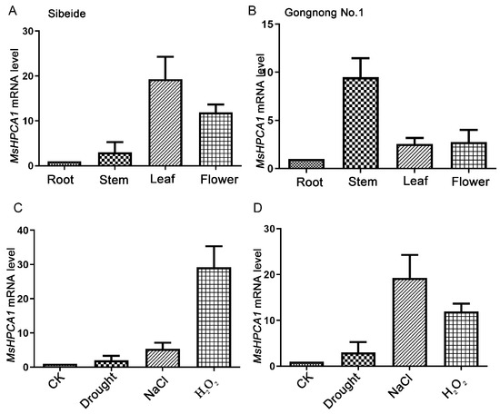 In addition, after a 3-week cultivation period of two alfalfa varieties, ‘Gongnong No.1’ and ‘Sibeide’, various treatments were applied to the seedlings. These included drought stress, application of 250 mM NaCl and 100 mM H2O2 (hydrogen peroxide). After 10 days of various treatments, the relative expression level of MsHPCA1 was determined and evaluated in the treated seedlings.