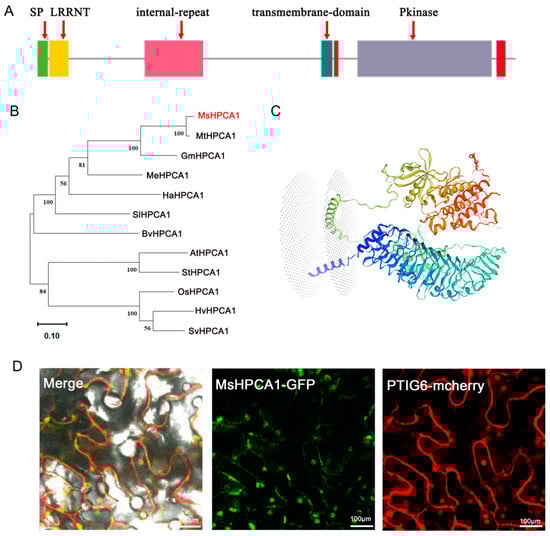 Bioinformatics analysis and subcellular localization of MsHPCA1. (A) Predicted domain architecture of MsHPCA1 proteins. SP: signal peptide. Each distinct structural domain is represented by a colored rectangle. (B) Phylogenetic analysis of HPCA1 homologs in different plant species. MsHPCA1: Medicago sruncatula, MsG0280007602.01; BvHPCA1: Beta vulgaris, XP_019105897.2; OsHPCA1: Oryza sativa, XP_015619793.1; MeHPCA1: Manihot esculenta, XP_021592399.1; MtHPCA1: Medicago truncatula, XP_003594434.2; GmHPCA1: Glycine max, XP_025979435.1; SvHPCA1: Setaria viridis, XP_034588472.1; AtHPCA1: Arabidopsis thaliana, NP_001321900.1; StHPCA1: Solanum tuberosum, XP_006338928.1; SlHPCA1: Solanum lycopersicum, XP_004230391.1; HaHPCA1: Helianthus annuus, XP_021981660.1; HvHPCA1: Hordeum vulgare, XP_044974898.1. (C) Three-dimensional structure of MsHPCA1 proteinThe red characters represent HPCA1 alfalfa, whereas the black letters represent other species. (D) Subcellular localization of MsHPCA1, PTIG6-mcherry as a marker for membranes.
