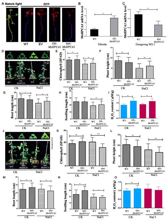 We investigated the involvement of MsHPCA1 in salt response in alfalfa. We generated transgenic plants overexpressing MsHPCA1 in the salt-sensitive cultivar ‘Sibeide’ and silenced MsHPCA1 expression in the salt-resistant cultivar ‘Gongnong NO.1’. Transgenic plants were obtained by hairy root transformation, and the transgenes were verified by RFP expression as the pKGWRR vector carried the RFP gene (Figure 8A), RT-qPCR was then used to detect overexpression and silencing efficiency (Figure 8B,C).Under salt stress, the leaf of the WT plant showed a yellowing phenotype while the leaf of the MsHPCA1-overexpressed plant displayed a normal phenotype (Figure 8D). On the contrary, the MsHPCA1-silenced plant showed compromised growth compared with the WT plant under salt stress (Figure 8J). At the same time, the chlorophyll content, plant height, root length, and seedling length of transgenic plants and WT were measured for H2O2 content. The chlorophyll content, plant height, root length, and seedling length were significantly higher in plants overexpressing the MsHPCA1 gene compared to wild type, whereas the chlorophyll content, seedling length, and root length were significantly lower in plants with suppressed MsHPCA1 gene expression (Figure 8E–H,K–N). The MsHPCA1-overexpressed plant accumulated more H2O2 compared with the WT plant while the MsHPCA1-silenced plant showed no differences (Figure 8I,O). The results showed that MsHPCA1 was associated with H2O2 accumulation, and overexpression of MsHPCA1 improved the salt tolerance of plants.
