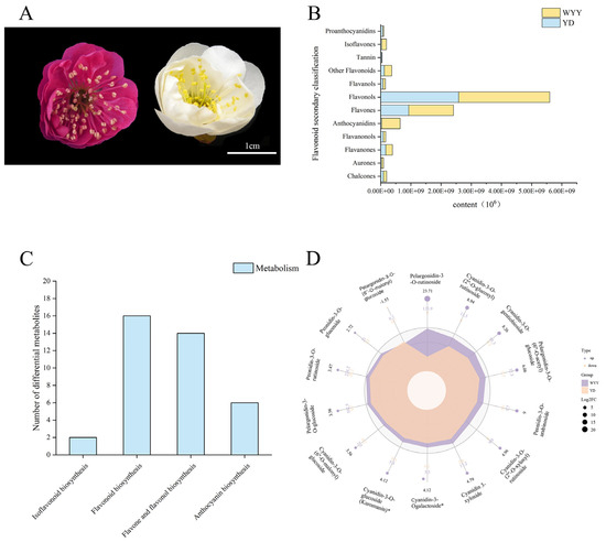Identification of DAMs: (A) morphology of P. mume, featuring the WYY variety with purple–red flowers and the YD variety with white flowers; (B) differences in flavonoid metabolites between YD and WYY; (C) KEGG enrichment analysis of DAMs; and (D) anthocyanin content in petals of different P. mume cultivars (in units of 106). * represents for isomer.