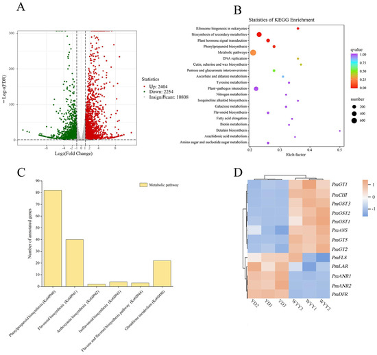 Analysis of DEGs: (A) number of DEGs in two P. mume cultivars; (B) top 20 KEGG-enriched DEGs represented by a bubble plot; (C) quantity of enriched genes in the KEGG pathway of the flavonoid metabolism pathway in P. mume; and (D) clustering heat maps illustrating the DEG expression in the anthocyanin synthesis pathway.