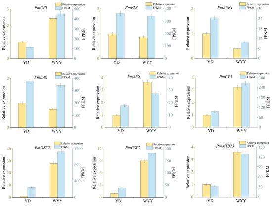 With reference to the gene expression level in white flower variety YD, 11 candidate genes (PmCHI, PmFLS, PmANR1, PmLAR, PmANS, PmGT5, PmGST2, PmGST3, PmMYB23, PmbHLH4, and PmMYB22) related to anthocyanin synthesis were identified by RT-qPCR (Figure 3 and Figure S8). The results indicated that the expression levels of PmCHI, PmANS, PmGT5, PmGST2, PmGST3, and PmMYB23 were up-regulated in purple–red flowers, while PmFLS, PmANR1, and PmLAR were down-regulated. In particular, the expression level of PmGST3 in purple–red flowers reached eight times higher than in white flowers. In contrast, the expression level of PmANR1 in purple–red flowers decreased by 2.6 times. The results demonstrated that the expression patterns of these 11 genes in YD and WYY aligned with transcriptome sequencing data.