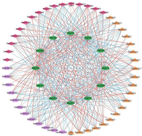 Correlation network between transcription factors and key structural genes (coefficients > 0.9 and p < 0.01). The inner circle represents key structural genes, and the outer circle represents the MYB, bHLH, and WRKY transcription factors. Red lines indicate positive correlations, and blue lines indicate negative correlations.