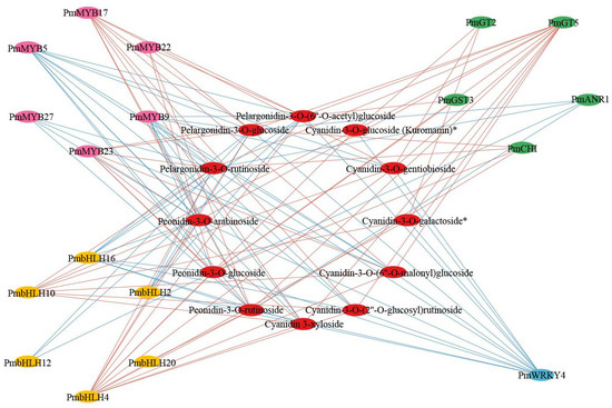 To clarify regulatory networks associated with anthocyanin synthesis, the correlation between 13 key genes of anthocyanin and anthocyanin content that were found to have high contents in purple–red flowers was analyzed (Figure 5, Table S8). The results revealed significant correlations between 12 anthocyanins and five structural genes in the anthocyanin synthesis pathway (p < 0.01). Among them, PmCHI, PmGT2, PmGT5, and PmGST3 were positively correlated with the content of anthocyanin in P. mume, while PmANR1 was negatively correlated. Additionally, six MYBs, six bHLHs, and one WRKY transcription factor genes were significantly correlated with twelve anthocyanins. Among them, PmMYB17, PmMYB22, PmMYB23, PmbHLH4, PmbHLH10, and PmbHLH20 were positively correlated with anthocyanin content, while PmMYB5, PmMYB9, PmMYB27, PmbHLH2, PmbHLH12, PmbHLH16, and PmWRKY4 were negatively correlated with anthocyanin content. Accordingly, it could be inferred that these five structural genes and thirteen transcription factor genes might have regulatory functions in the process of anthocyanin production. Among them, the gene regulatory network consisting of ten genes (PmCHI, PmGT2, PmGT5, PmGST3, PmMYB17, PmMYB22, PmMYB23, PmbHLH4, PmbHLH10, and PmbHLH20) might play a critical role in promoting the accumulation of anthocyanosides.