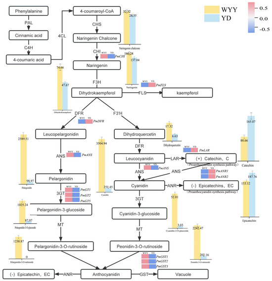 Anthocyanin biosynthesis pathways in P. mume flower petals. The histogram shows the contents of key metabolites in YD and WYY, and the heatmap depicts the differences in key gene expression.
