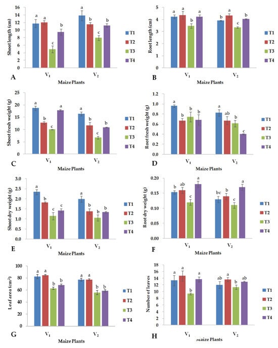 Effects of copper oxide nanoparticles and salinity stress on (A) shoot length, (B) root length, (C) shoot fresh weight, (D) root fresh weight, (E) shoot dry weight, (F) root dry weight, (G) leaf area index, (H) number of leaves in maize hybrid YH-5427 (V1) and FH-1046 (V2). T1: control; T2: foliar CuO-NPs; T3: salinity stress; T4: salinity stress + foliar CuO-NPs. Different letters demonstrate significant differences among the treatments (p < 0.05).