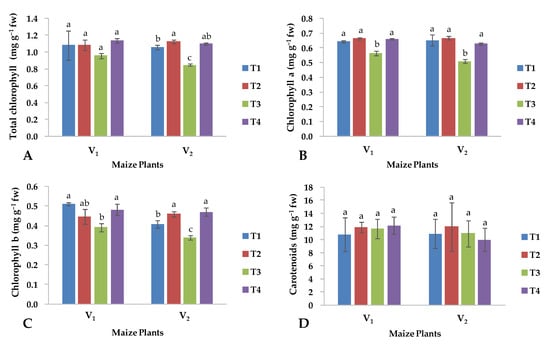 Effects of copper oxide nanoparticles and salinity stress on (A) total chlorophyll, (B) chlorophyll a, (C) chlorophyll b, (D) carotenoids in both maize hybrids (V1: YH-5427; V2: FH-1046). T1: control; T2: foliar CuO-NPs; T3: salinity stress; T4: salinity stress + foliar CuO-NPs. Different letters demonstrate significant differences among the treatments (p < 0.05).