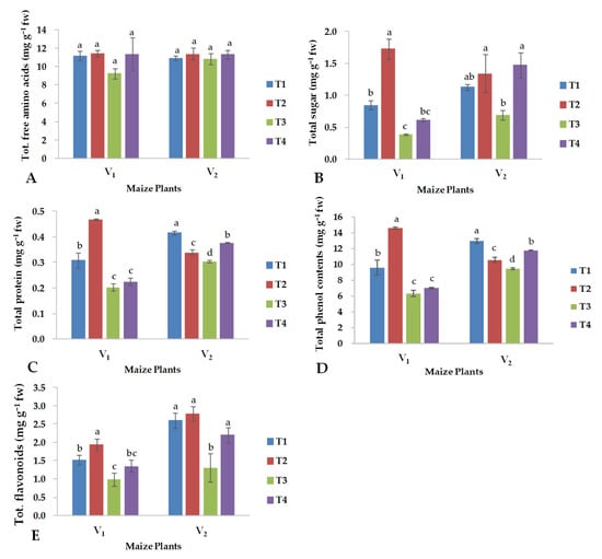 Effects of copper oxide nanoparticles and salinity stress on (A) total free amino acids, (B) total sugars, (C) total protein, (D) total phenol and (E) total flavonoids in both maize hybrids (V1: YH-5427; V2: FH-1046). T1: control; T2: foliar CuO-NPs; T3: salinity stress; T4: salinity stress + foliar CuO-NPs. Different letters demonstrate significant differences among the treatments (p < 0.05).