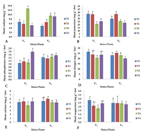 Effects of copper oxide nanoparticles and salinity stress on (A) total sodium, (B) total potassium, (C) total phosphorus, (D) total nitrogen, (E) total calcium, (F) total magnesium, in shoots of both maize hybrids (V1: YH-5427; V2: FH-1046). T1: control; T2: foliar CuO-NPs; T3: salinity stress; T4: salinity stress + foliar CuO-NPs. Different letters demonstrate significant differences among the treatments (p < 0.05).