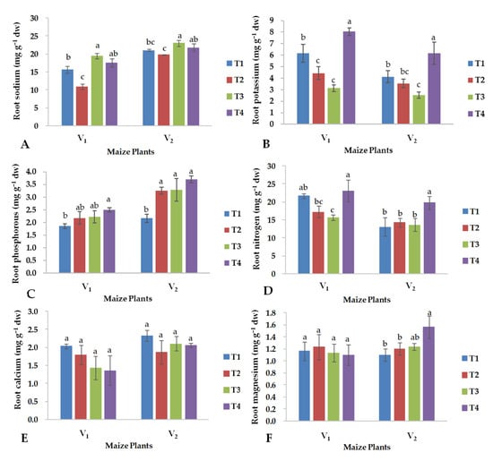 Effects of copper oxide nanoparticles and salinity stress on (A) total sodium, (B) total potassium, (C) total phosphorus, (D) total nitrogen, (E) total calcium, (F) total magnesium, contents in roots of two maize hybrids (V1: YH-5427; V2: FH-1046). T1: control; T2: foliar CuO-NPs; T3: salinity stress; T4: salinity stress + foliar CuO-NPs. Different letters indicate significant differences among the treatments (p < 0.05).