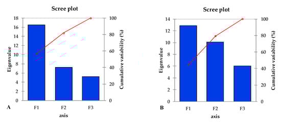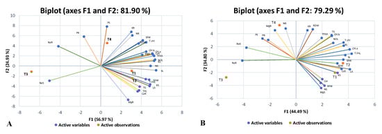 Principal component analysis (PCA) is a multivariate statistical analysis normally used to interpret large datasets. In the current investigation, loading plots of PCA were developed for both selected maize hybrids separately to assess the alterations in morpho-physiological and biochemical attributes under saline conditions and CuO-NPs application, alone or in combination, compared to the control (Figure 6A,B). The length of the vector from the centroid region of the biplot to the peripheral area of the constructed biplot showed the degree of variation among the traits studied. Between both maize hybrids, the PCA developed for YH-5427 (V1) revealed that the results could be explained by assessing the contribution of the first two main components, i.e., PC1 (56.97%) and PC2 (24.93%). The eigenvalues of the first three principal components (PCs) were greater than 1, but the cumulative variability of the first two PCs was (81.9%), and therefore, a biplot was constructed between the first two principal components (Figure 7A,B). The biplot analysis was performed for hybrid YH-5427 (V1) using XL-STAT software (version 2019) which depicted that CuO-NPs treatment (T2) was effective in revealing coherent synergistic variations among several attributes such as total phenolic contents (TPC), total sugars (TS), root carotenoids content (CaR) and root magnesium content (MgR) as their vector lengths were in the same direction, while these changes were antagonistic with variations in root sodium (NaR) and phosphorus (PR) contents as the vector length was laying in the opposite direction present in the first quadrant of the constructed biplot. The maize plants grown under salinity stress (T3) revealed noticeable alterations in sodium concentration (NaS) in the shoot of the hybrid YH-5427 and showed a negative interaction with the concentration of SFW, RDW and Chl.b. Furthermore, treatment with CuO-NPs+Salinity stress (T4) revealed alterations in the concentrations of several key nutrients such as shoot phosphorus (PS), root potassium (KR) and root nitrogen content (NR). However, maize plants grown under control conditions (T1) showed synergistic variation patterns of several imperative attributes such as dry weight of the shoot (SDW), length of the shoot (SL) and the nitrogen content of the shoot (NS) (Figure 6A).