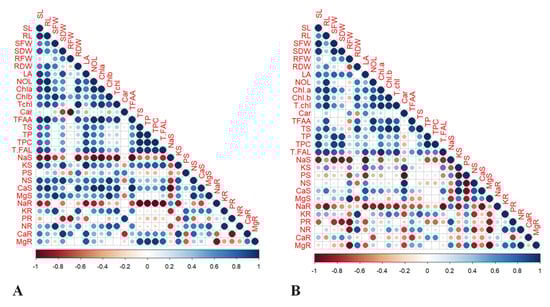 Pearson’s correlation analyses of both selected maize hybrids (A) YH-5427 and (B) FH-1046 for all studied growth, physiological and biochemical attributes.
