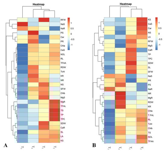 The heatmap analysis conducted for hybrid YH-5427 showed two main clusters for applied treatments. In the first cluster, various attributes were grouped under salinity stress (T3) and were negatively correlated with most of the traits except sodium content in the shoot and root of the growing hybrid (Figure 9A). However, in the second main cluster, three treatments were grouped where a combination of CuO-NPs + 5 μM salinity stress (T4) indicated a strong positive link with shoot phosphorus (PS) and roots potassium concentration (KR), while a slight negative relationship with root magnesium ions (MgR) was manifested. In addition, the hybrid YH-5427 grown under the control condition (T1) showed a strong positive correlation with root fresh weight (RFW) and shoot dry weight (SDW), while it was negative with carotenoids (Car) and the concentration phosphorus in the roots (PR). Additionally, the foliar spray of CuO-NPs (T2) showed a positive relationship among TPC, TS and TP and a negative interaction with the Na content of the roots (NaR), (Figure 9A).