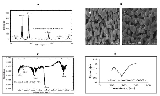 The copper oxide nanoparticles were prepared by the Physics Department, GC University, Faisalabad, Pakistan []. To estimate the crystalline structure of the particles, CuO-NPs were subjected to XRD analysis (Figure 10A). The lattice constant and D spacing were calculated using Scherrer’s equation (d = Kλ/β cosθ), and together with data obtained from diffracted peaks, the crystal size of CuO-NPs was about 20 nm. During the next step, the surface morphology of nanoparticles was studied through scanning electron microscopy. Moreover, SEM analysis was also performed, depicting TEM images of CuO-NPs with specific micrograph sizes. Additionally, SEM images revealed a uniform distribution of the nanoparticles studied (Figure 10B), with a monoclinic shape and aggregated in the form of clusters. FTIR spectroscopy confirmed the synthesis of CuO-NPs (Figure 10C). Lastly, the absorption spectrum indicated a peak between 200 and 300 nm (Figure 10D).
