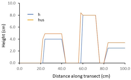 Comparison of sensor-determined and measured height of parallelepipeds in the laboratory. ultrasonic data (hus = orange line) overlaid by ground truth data (h = blue line).