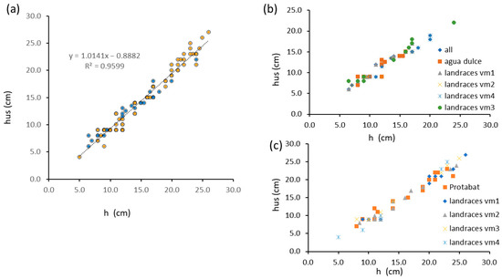 Height measurements in a Vicia faba L. field setting. (a) bivariate plot of ultrasound-measured heights as a function of ground truth data for Vicia faba L. var. major (blue dots) and Vicia faba L. var. minor (orange dots); (b) bivariate plot of ultrasound-measured heights as a function of ground truth data for Vicia faba L. var. major by variety; (c) bivariate plot of ultrasound-measured heights as a function of ground truth data for Vicia faba L. var. minor by variety.