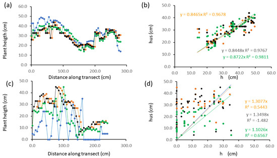 In the case of plant spacing of 30 cm (Figure 3c,d), hus data (orange dots) follow the overall crop profile but fail to reconstruct short-scale variability in plant height, and especially bare-soil points (e.g., at 50, 85 and 115 cm along the transect) and a whole bare-soil stretch between cm 165 and 215 along the transect. The maximum correlation is found at lag 2 but even data shifted in 2 lags (black dots in Figure 3c,d) do not reproduce short-scale variability and relevant very low height or zero values. The use of a dynamic time warping algorithm yielded a DTW distance of 7.94, and a better reproduction of the pattern of manual data is found with a data series calculated with dynamic time-warping (Figure 3c green dots). However, very low and zero values are not reproduced. The correlation between manual and sensor data is lower for plants spaced at 30 cm than for those at 5 cm but is still significant (p-value = 0.04). The univariate regression model still explains a considerable amount of the total variability if the line is forced to pass through the origin (R2 = 0.57 for data after 2-lag shifting and 0.66 for data after DTW correction). Sensor data overestimate height by about 14.0 cm on average in this transect after 2-lag shifting (black dots) and 7.3 cm after correction with DTW (green dots).