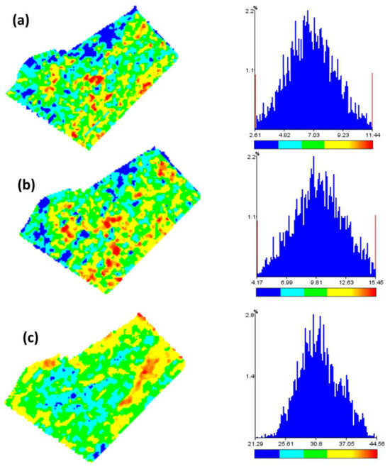 Values of ultrasound-measured plant height ranged between 2.51 and 12.07 cm on the first date, between 3.97 and 16.75 am on the second, and between 8.02 and 57.76 cm on the third. Plant height showed an unimodal frequency distribution at all three dates (Figure 4 right), but values were not spatially distributed at random in the field: maps show that clusters of low values (blue areas) were found in the top and left field zones, and high values (red areas) in the center of the field in the first two dates, whereas at the third date high values (red areas) were found at the top edge and in a strip inside the field, and low values (blue areas) in the center, and frequencies were slightly skewed to the left: height values lower than the mode were less frequent.