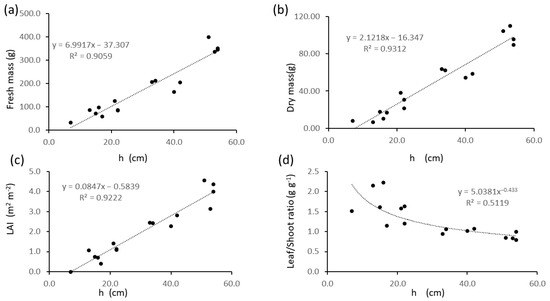 Figure 5 shows the relationships between manually measured plant height (h) and other biometrics. Significant (p < 0.05) linear regressions with R2 values higher than 0.9 were found with fresh and dry mass and LAI (Figure 5a–c), and a power regression with leaf/stem ratio (Figure 5d).