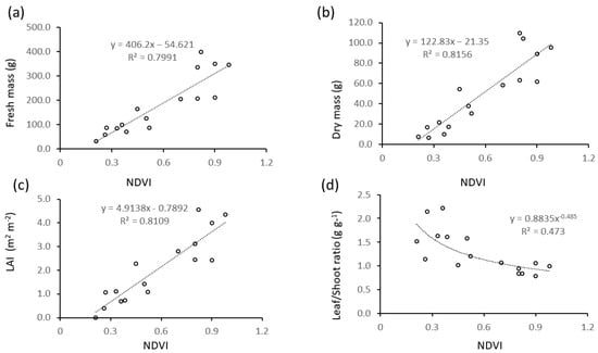 The same regression models were fitted for relationships between normalized difference vegetation index (NDVI) and other biometrics (Figure 6), which were all significant (p < 0.05) and linear for fresh and dry mass and LAI (Figure 6a–c), and power regression for leaf/stem ratio (Figure 6d). Values of R2 were lower than those found for regressions with plant height (Figure 5).