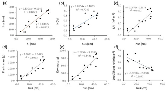 Relationships between alfalfa biometrics and ultrasound-measured plant height (hus): (a) hus as a function of manually measured plant height (h); (b) NDVI as a function of hus; (c) Leaf Area Index as a function of hus; (d) fresh mass as a function of hus; (e) dry mass as a function of hus; (f) leaf to stem mass ratio as a function of hus.