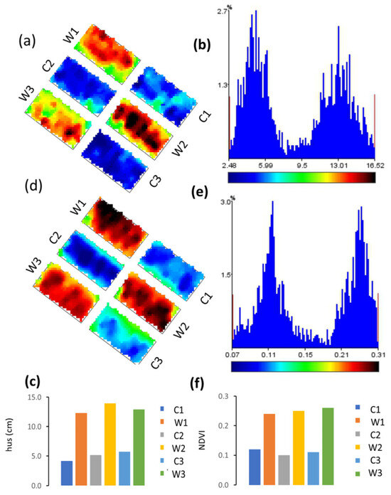 Maps of the experimental field of wheat; (a) hus values across the field; (b) hus values frequency distribution; (c) hus in each plot: colored bars = average values. Line bars: standard deviation; (d) NDVI values across the field; (e) NDVI values frequency distribution; (f) NDVI in each plot: colored bars = average values. Line bars: standard deviation. C1, C2, and C3 = three replicate plots of treatment C = wheat cut at stage 30 of the Zadoks scale; W1, W2, W3 = three replicate plots of treatment W: uncut wheat plants.