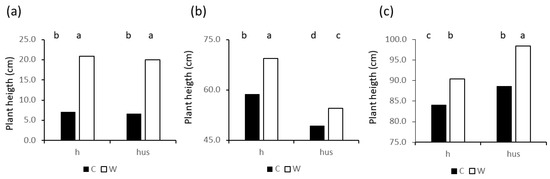 Height of wheat plants from manual measurements (h) or derived from an ultrasound sensor (hs). Values represent averages of treatments C = wheat cut at stage 30 of the Zadoks scale and W: uncut wheat plants. (a): the end of tillering; (b) booting; (c) grain filling. Different letters indicate significant (p < 0.05) differences in Tukey’s post-hoc test.