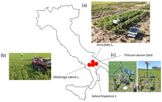 Field tests were conducted at four sites in Southern Italy as indicated in Figure 11 on crops of different geometry and namely: