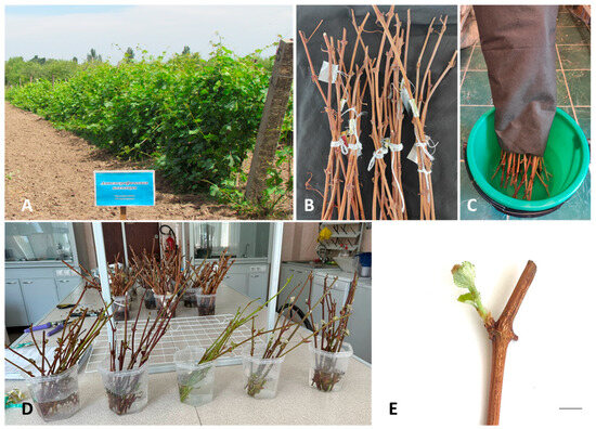 Field collection of grapevine hybrids grown in the experimental area of Kazakh Scientific Research Institute of Fruit Growing and Viticulture in Almaty (A). Cuttings of grapevine hybrids harvested in November (B) and cold-treated in a refrigerated room at 4 °C for 2 months (C) before moving to laboratory conditions at 24 ± 1 °C and with a photoperiod of 10 h 30 min for bud sprouting (D,E). Bar in E = 1 cm.