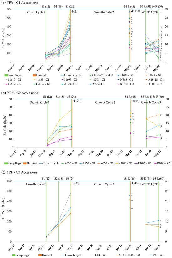 The first group (G1, Figure 1) comprised 12 guayule pure accessions, the nine traditional ones (11600, 11604, 11619, 11635, 11693, 11701, N565 and A48118) and the other four modern ones (CFS17-2005, AZ-5, R1108, and CAL-7), together with six modern hybrids (CAL-1, CAL-2, AZ-3, R1100, R1101 and R1103), whose common characteristics were that the rubber production tended to increase from S1 (June 2018) to S2 (November 2018), and that it significantly increased in S3 (April 2019) (Table 3). Within this group, five accessions displayed a slightly different behavior: 11604, 11619 and CAL-2 showed the same level of production between S2 and S3, and the levels of rubber in 11701 and R1103 were not significantly different between the three samplings S1–S3. Examination of the evolution of rubber production in the second cycle after the first harvest revealed that the level of rubber production was the same for 24-month-old plants before and after harvesting (S3 versus S4R) for eight accessions (denoted as = in Figure 1). Contrastingly, four accessions (11635, A48118, CAL-1 and R1101) showed a decrease in the rubber content in S4R, while six accessions (11600, 11604, 11619, 11693, 11701 and R1103) showed an increase (Figure 1).