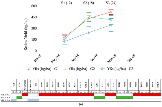 Thus, Rs1 accessions would produce resin both in summer and winter, Rs2 members would produce resin in summer, and Rs3 members would accumulate resin in summer, but see a decrease during winter. These findings are in accord with a previous study by Jara et al. [2], who analyzed the pattern of production of resin throughout the vegetative cycle from 12 to 24 months and reported that winter would be the optimum harvesting time for the pure accessions AZ-1 and AZ-6, while spring would be best for hybrids and some other pure accessions. The best resin producer germplasm was the pure traditional accession 11600 in S3 (1196.3 kg ha−1), which belonged to G2 (Table 2).