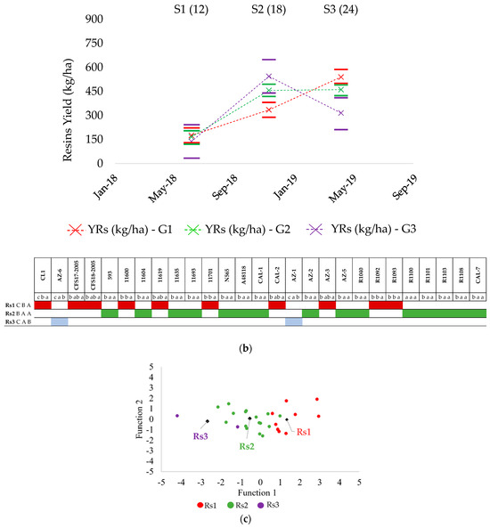 As before, three different groups (Rs1, Rs2 and Rs3) that correctly classified 85.2% of the accessions were obtained (Figure 3c). The first group (Rs1) comprised eight pure guayule accessions, two traditional (11600, 11619) and six modern accessions (11591 (CL1), CFS17-2005, CFS18-2005, R1092, and R1093) and two hybrids (AZ-3 and CAL-2). This group was characterized by a progressive increase in the resin yield from S1 (12 months after transplanting) to S3 (CBA profile attending to statistical significance).