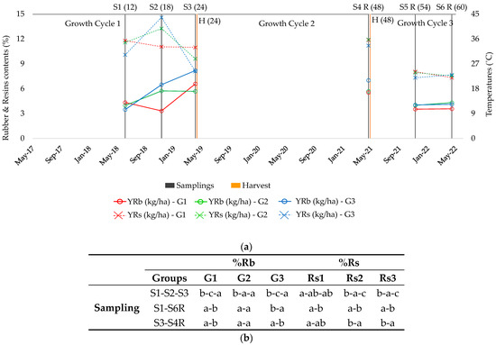 In contrast to rubber, the evolution of the resin content was different to that established for resin production in the classified groups (Figure 3). The content in Rs1 (%, Figure 4) remained constant while the yield always increased (Figure 3). The resin content in Rs2 (%) increased considerably in summer and decreased significantly during winter, but the total yield remained constant due to the greater biomass production (Figure 3). Finally, the resin content in Rs3 was at its maximum in S2, but the lowest percentage occurred in S3 (Figure 4) instead of S1 when the yield was considered (Figure 3); this is logical considering that the biomass increased over time. Concerning the following two cycles, the resin percentage decreased in 12-month-old plants in the three groups, likely because the accumulation of resin starts at a precise moment after replantation or regrowth [20]. This can be corroborated when analyzing 24-month old plants, whose resin content increased in G2 and G3 and remained constant in G1. This demonstrates again that rubber and resin accumulation are not related and are dependent on the accession [3,22] and the plant growth.