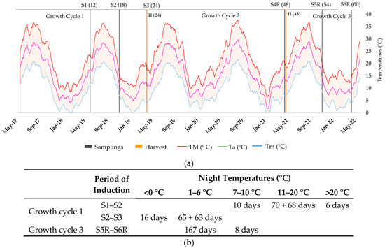 The study was established at a single location (39°53′47.26″ N; −3°07′51.87″ W) in a 0.5 ha experimental field of Santa Cruz de la Zarza. The design of the plot and the experimental characteristics of the investigation have been described previously [2], including the irrigation and fertilization regimes. The crop was studied for three cycles. The first cycle was 24 months and three sampling periods were considered (May and November 2018, and April 2019), at 13, 18 and 24 months after plantation (henceforth referred to as S1, S2 and S3). A second 24-month cycle ended in April 2021 (S4R), 48 months from transplantation. Finally, a 12-month cycle was tested, for which two samples were taken in December 2021 and April 2022 at 56 and 60 months after transplantation (S5R and S6R, respectively).