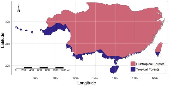 Distribution map of the subtropical evergreen broad-leaved forests in China. The map was drawn by Jian Zhang from the School of Ecological and Environmental Sciences, East China Normal University. Notes: The red patches show the distribution of subtropical forests in China, of which the subtropical evergreen broad-leaved forest, as the zonal forest vegetation type, occurs in lowland areas below 1000 m above sea level, while coniferous forests and coniferous–evergreen broad-leaved mixed or coniferous–deciduous broad-leaved mixed forests occur on mountains above 1000 m above sea level. The blue patches show the distribution of tropical forests, of which the tropical rain forest and tropical monsoon forest, as the zonal forests, occur in lowland areas below 900 m above sea level, while tropical montane evergreen broad-leaved forests and tropical coniferous forests occur on mountains above 900 m above sea level.