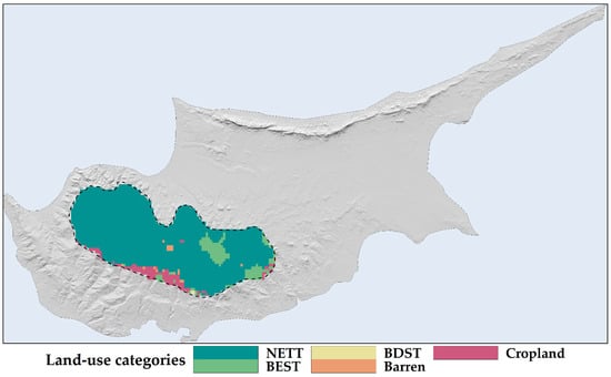 Baseline land-use types in the study area. Acronyms: BDST (broadleaf deciduous temperate shrubs), BEST (broadleaf evergreen temperate shrubs), NETT (needleleaf evergreen trees; conifers). The black dashed line delineates the IUCN-defined potential distribution area of Quercus alnifolia.